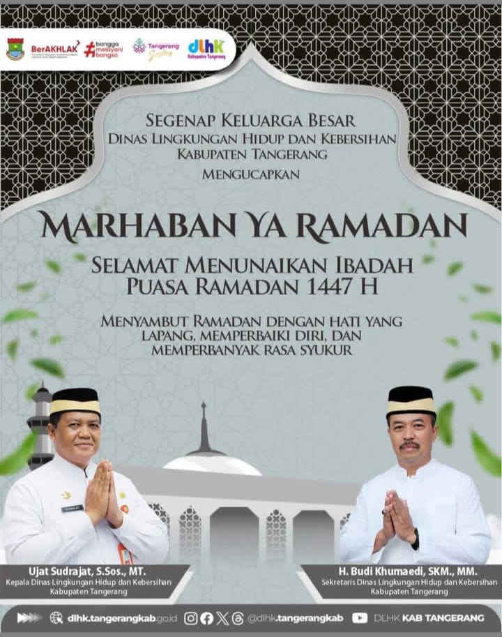 Segenap Keluarga Besar Dinas Lingkungan Hidup dan Kebersihan (DLHK) Kab Tangerang mengucapkan marhaban ya ramadan selamat menunaikan ibadah puasaramadan 1447 H.